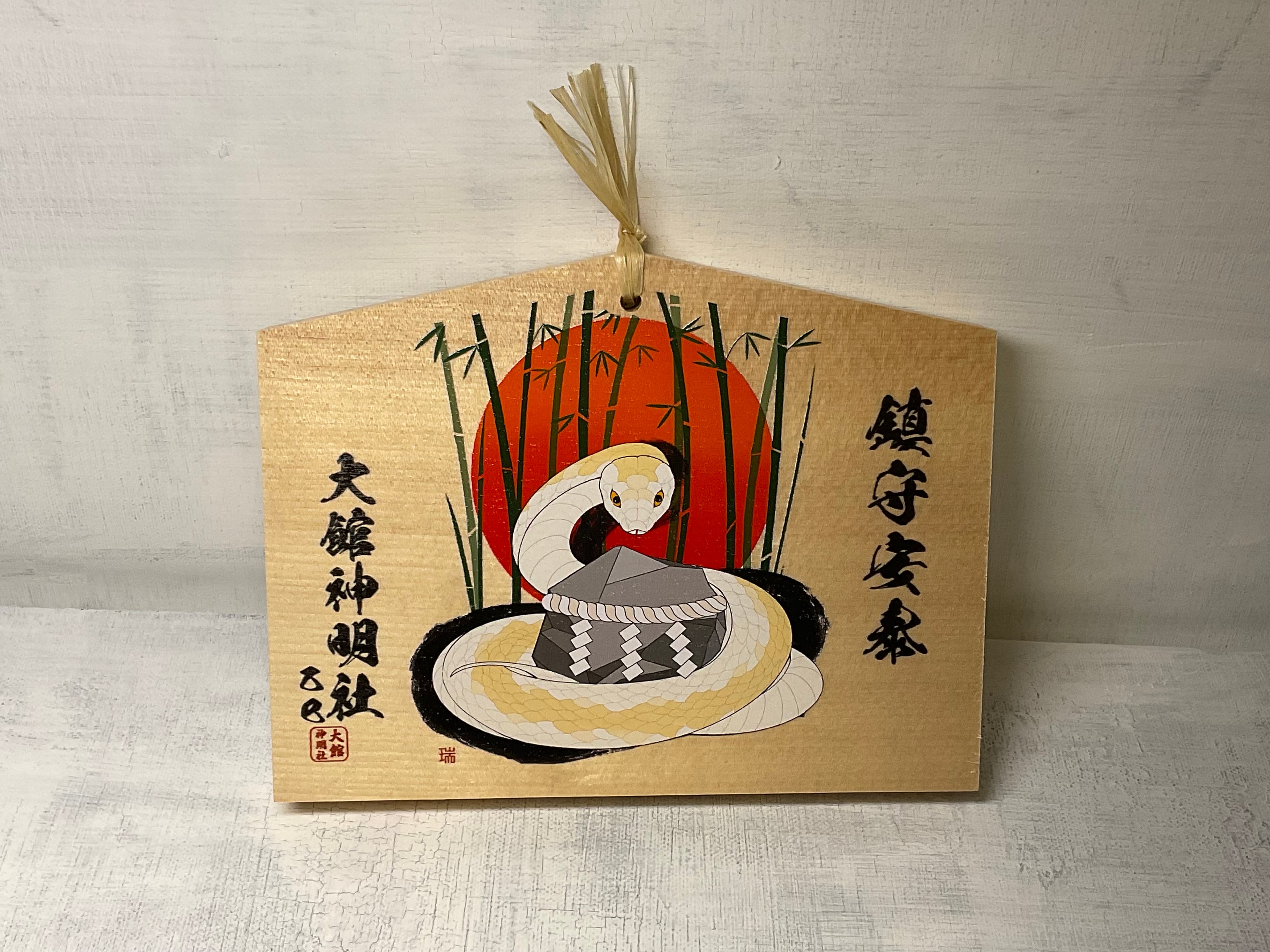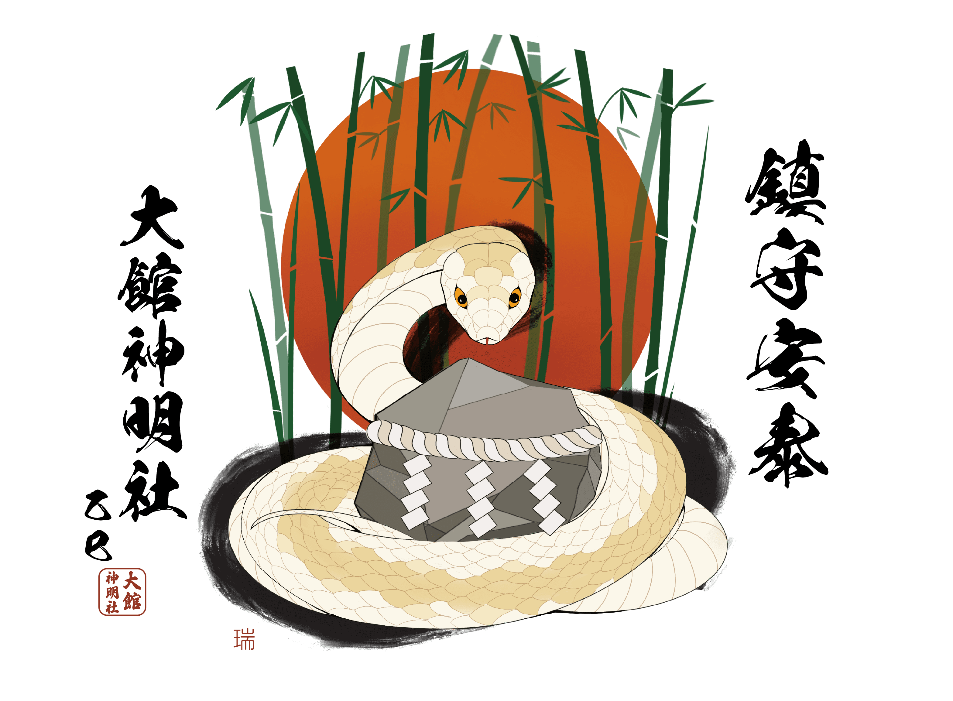 大館神明社様の干支絵馬デザイン 2024年と2025年の干支絵馬を制作。2024年は辰年の絵馬に参拝者を見守る思いを込め、2025年は災害から人々を守り、竹のように力強く成長する未来を願い、蛇をデザインしました。