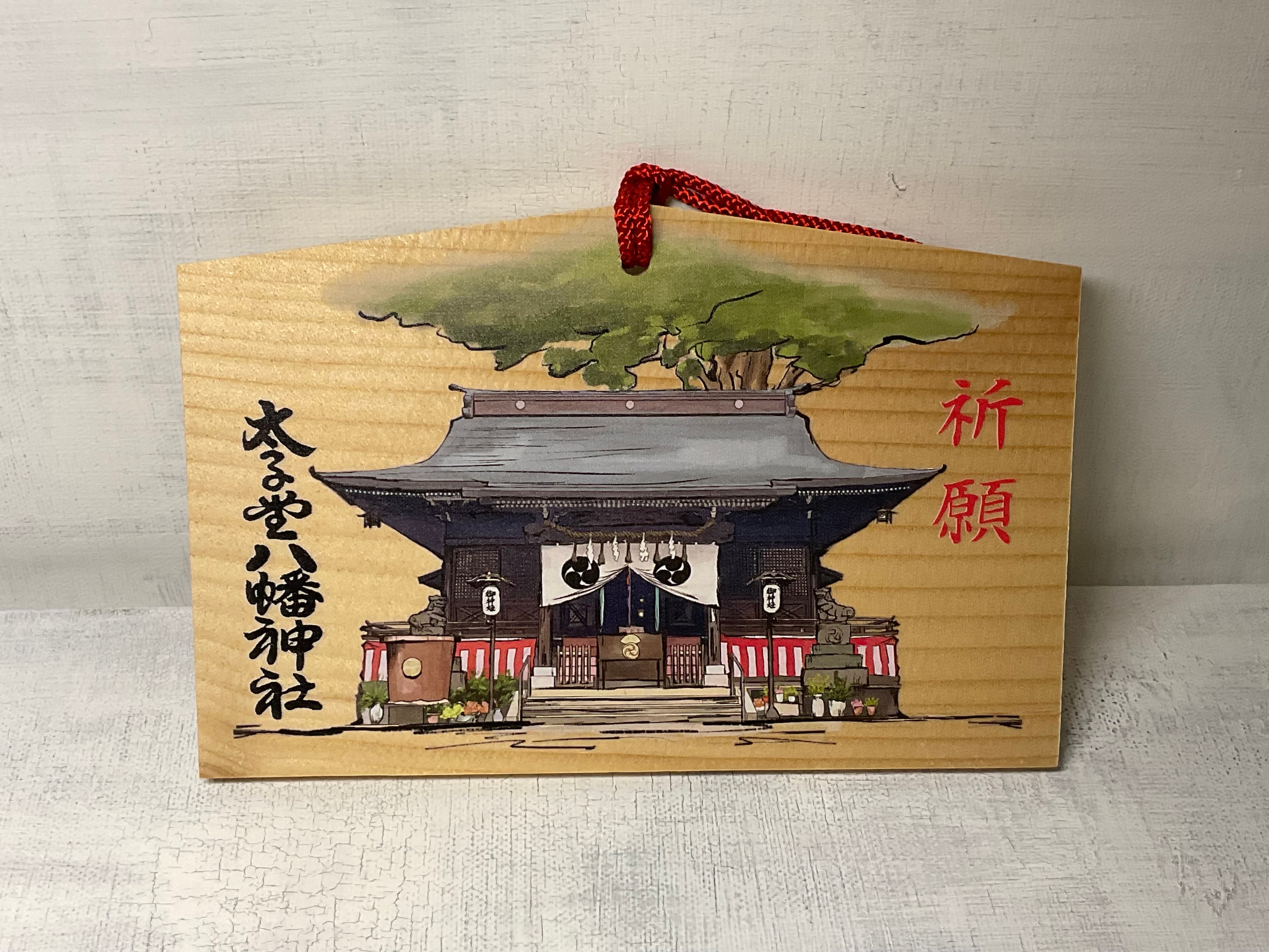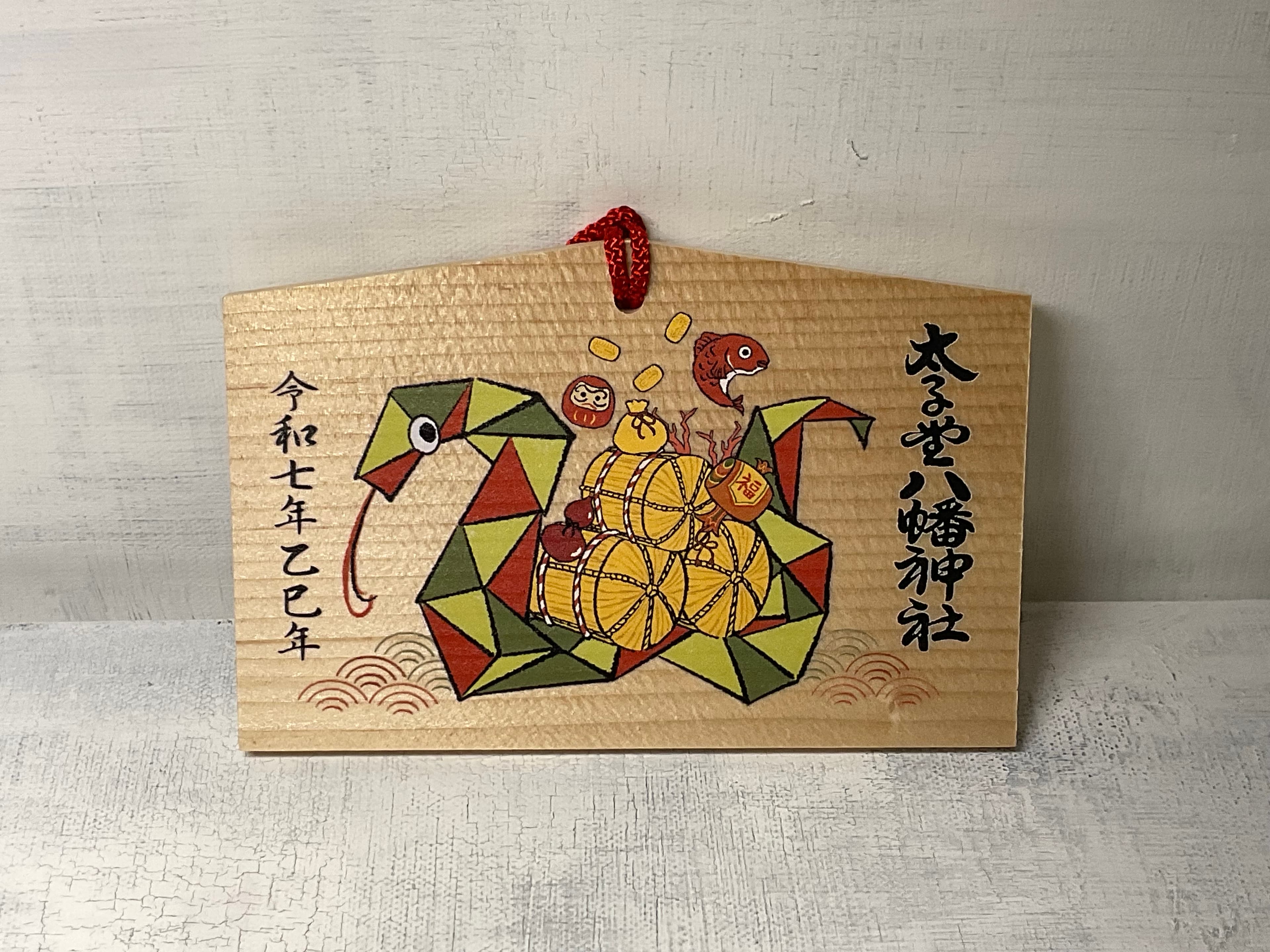 太子堂八幡神社様の絵馬デザイン 2025年の干支絵馬は折り紙をモチーフにした遊び心のある蛇をデザインし、縁起絵馬は御神木とお社を柔らかい水彩画風で表現。通年使用できる伝統的で落ち着いたデザインに仕上げました。
