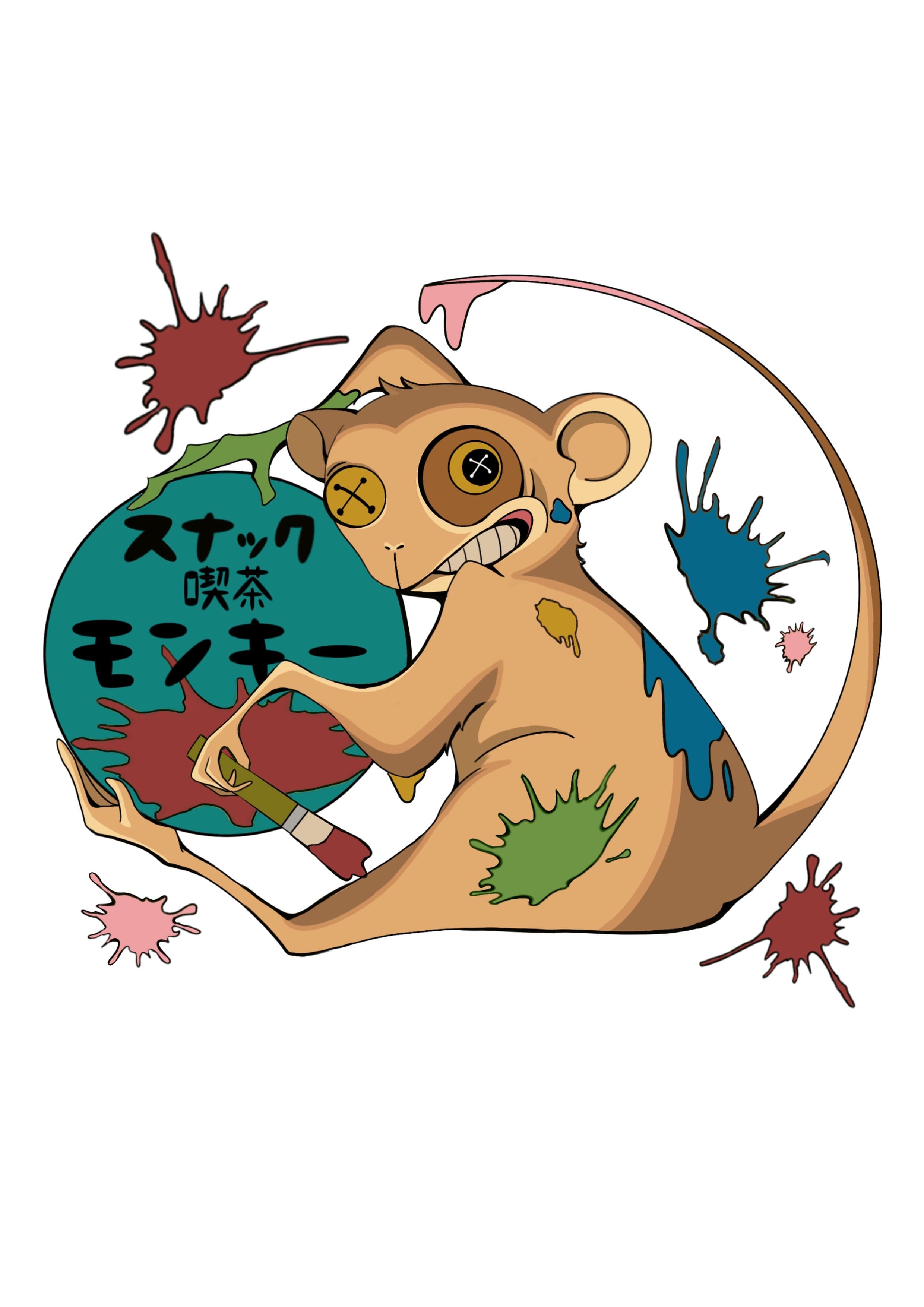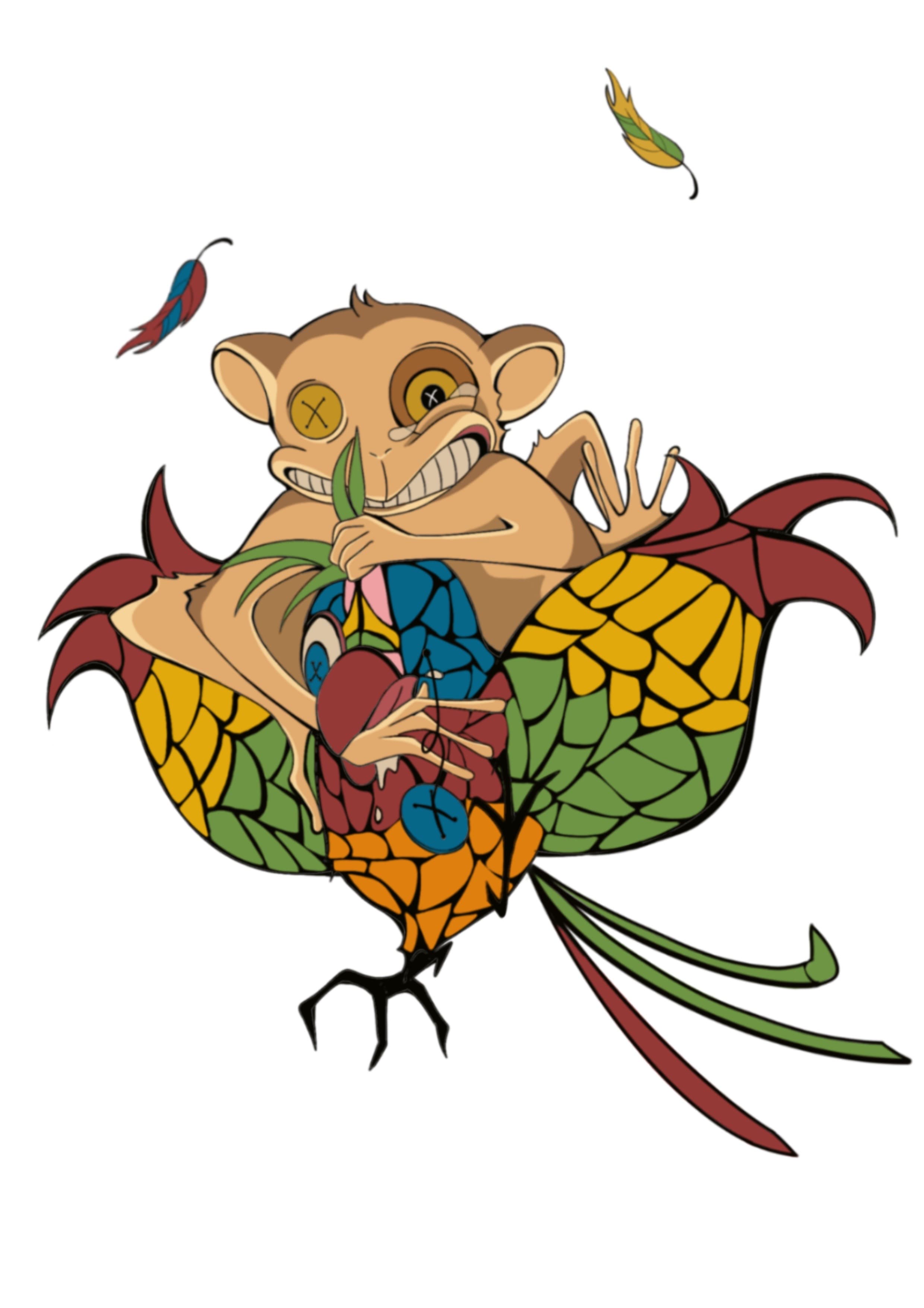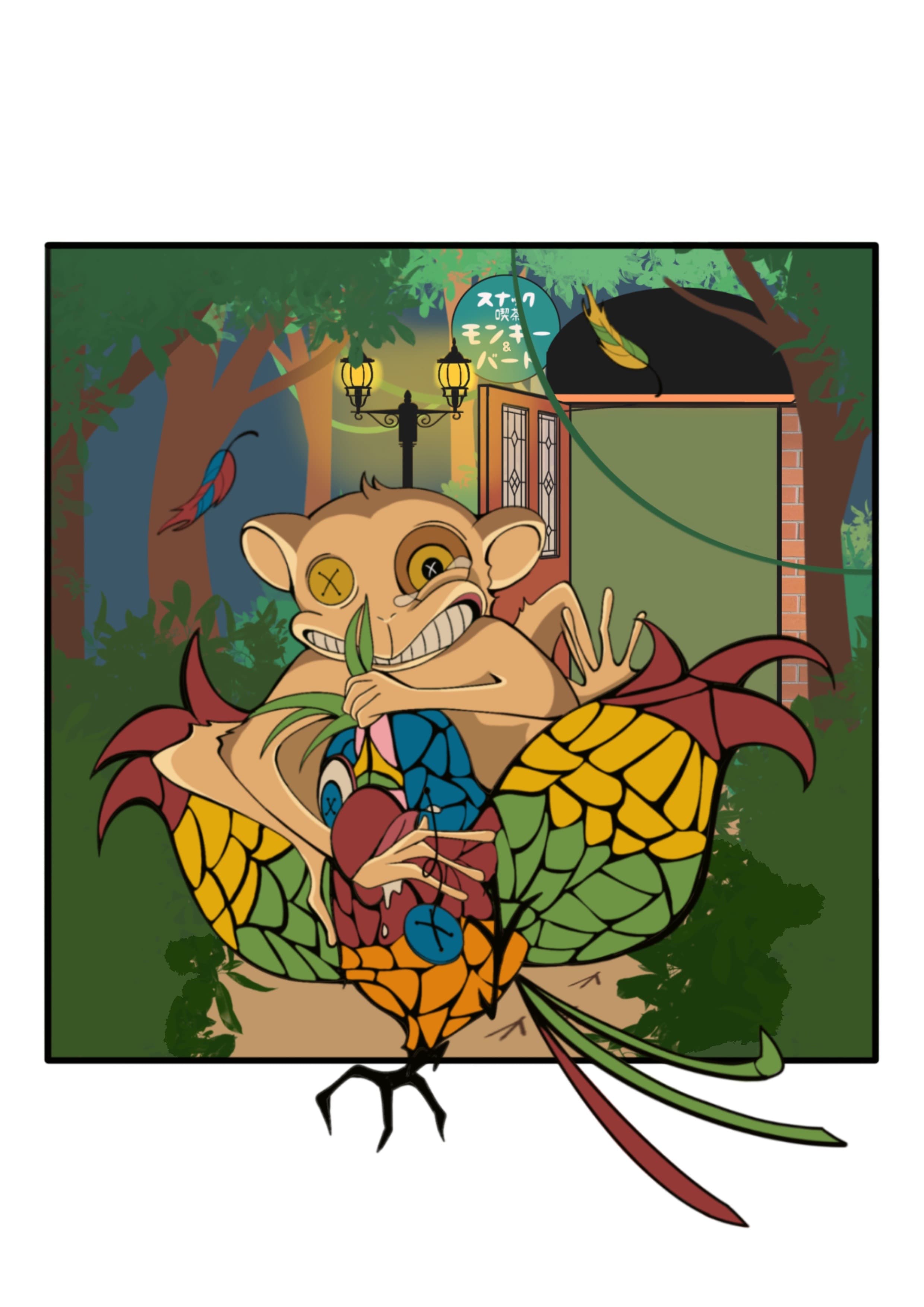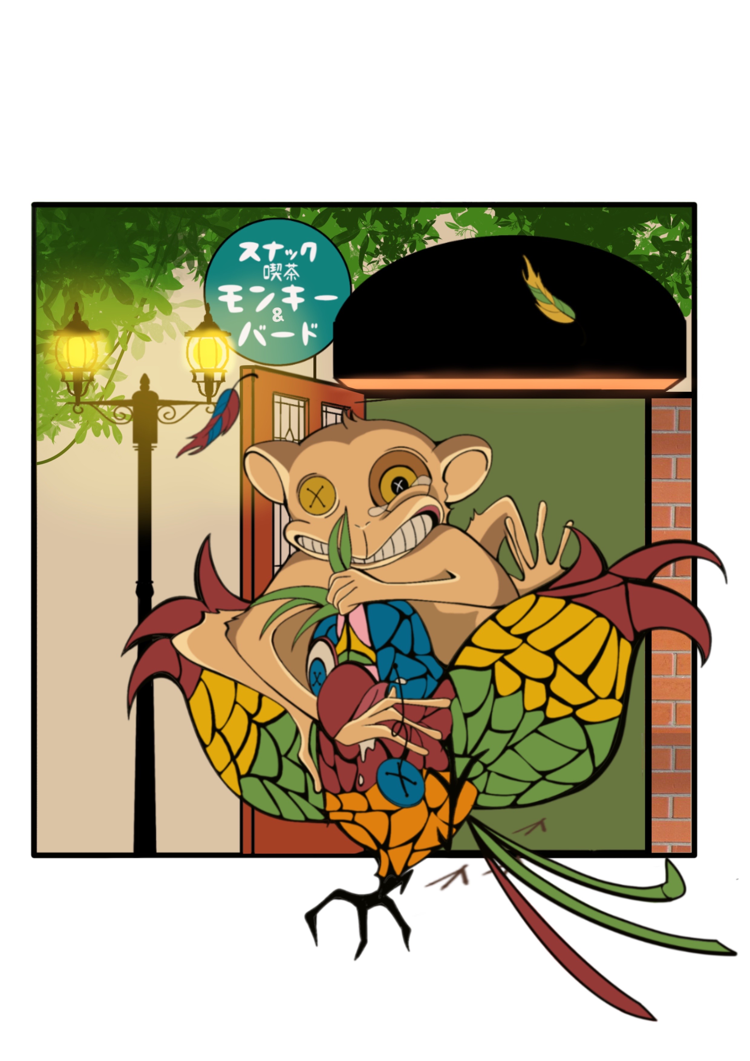喫茶店・BARのキャラクターデザイン ステンドグラスの鳥と壁紙の猿のオリジナルキャラクターを制作。レトロ調の色味で個性を出し、シンプルで親しみやすいデザインでキャラクターの性格が伝わるよう工夫しました。